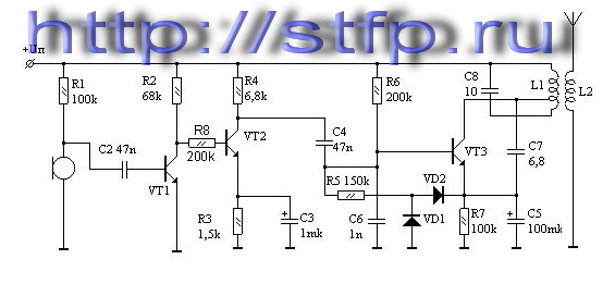 Преобразованный звуковой сигнал с микрофона поступает на двухкаскадный усилитель звуковой частоты VT1, VT2, коэффициент усиления которого задается резистором R3, и далее подается на вход генератора VT3. Генератор ВЧ выполнен по схеме индуктивной трехточки. Контур L1C8 настроен на частоту 140 МГц.