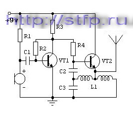 Жучок собран по схеме Хартли с нестандартным включением обратной связи, благодаря чему имеет КПД на 10-20% выше аналогичных схем. Эта схема аналогична примененной в простейшем телефонном жуке.Как правило, схема начинает работать сразу после сборки. Если в приемнике слышен писк, следует зашунтировать схему конденсатором емкостью не менее 1 мкф. Антенну лучше подключить через кондер емкостью 1-2 пф.