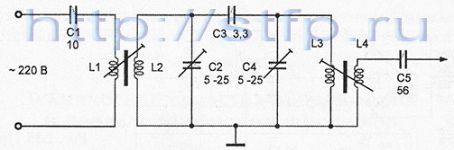 Конденсатор С1 исключает проникновение напряжения сети в катушку L1 и на вход используемого приемника. Катушки L2, L3, L4 и конденсаторы С2, СЗ, С4 образуют двухконтурный ФСС. С катушки L4 отфильтрованный сигнал поступает на вход приемника. Катушки LI, L2, L3, L4 намотаны на каркасах от КВ-катушек переносных радиоприемников. Катушка L1 имеет 2 витка, L2, L3 — по 14 витков, L4 — 5 витков. Все катушки намотаны проводом ПЭВ 0,23. Конденсатор С1 на напряжение не ниже 250 В, конденсаторы С2 и С4 подстроенные.