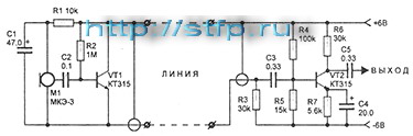 Устройство разделено на две части. Одна из них собрана на транзисторе VT1 типа КТЗ 15 по схеме с общим коллектором, а вторая — на транзисторе VT2 по схеме с общим эмиттером. Сигнал, снимаемый с электретного микрофона с усилителем типа МКЭ-3, поступает на базу транзистора VT1. Нагрузкой этого каскада служит резистор R3, расположенный во второй части устройства. Это сопротивление необходимо для обеспечения питания входного каскада на транзисторе VT1 при минимальном количестве соединительных проводов. Сигнал, снимаемый с резистора R3, через конденсатор СЗ поступает на УЗЧ, собранный на транзисторе VT2 типа КТ315.