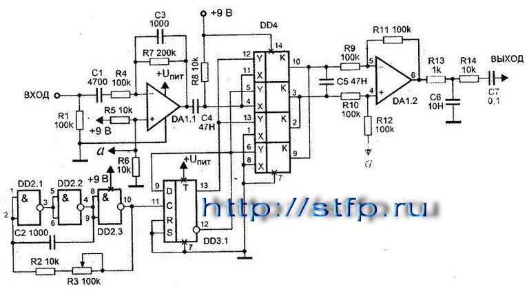 Это устройство состоит из тактового генератора на микросхеме DD2 типа К561ЛА7, вырабатывающего сигнал частотой 7 кГц, делителя-формирователя несущей 3,5 кГц на микросхеме DD3.1 типа К561ТМ2, аналогового коммутатора балансного модулятора на микросхеме DD4 типа K561KT3, входного полосового фильтра с полосой пропускания 300-3000 Гц на микросхеме DА1.1 типа К574УД2 и сумматора балансного модулятора с фильтром низкой частоты на микросхеме DА1.2. Подстройка частоты тактовых импульсов, а следовательно частоты несущей, производится многооборотным резистором R3.