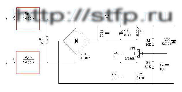 В этой схеме частотная модуляция осуществляется путем изменения параметров транзистора в зависимости от протекающего тока. Радиоретранслятор работает в диапазоне частот 65-108 МГц . Задающий генератор выполнен на транзисторе VT1 типа КТ368. Частота генератора определяется пареметрами колебательного контура-индуктивностью катушки L1 и емкостью конденсатора С3. Конденсатор С4 обеспечивает оптимальные условия возбуждения генератора. Дроссели Др1 и Др2 разделяют ВЧ и НЧ сигналы. Но мы Вам настоятельно рекомендуем не включать их в схему. Поясним почему. Принцип работы дросселя состоит в том, что при протекании через него тока он запасает энергию. И всесте с тем не пропускает ВЧ сигналы. А теперь представьте что у Вашего абонента стоит высокоскоростной интернет, который в свою очередь работает по схеме уплотнения передачи данных на частоте радио сигнала. Или на крайний случай евро АОН. Тогда все. Скандал, вызов мастера, и в конце концов они найдут все таки в чем причина. Ну а дальше будет дело техники. Но это уже отступления. С коллектора транзистора VT1 сигнал через конденсатор С2 поступает в антенну. В качестве антенны используется отрезок монтажного провода.