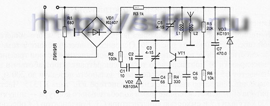 Резистор R1 включается в разрыв одного из проводов телефонной сети. При снятии трубки телефонного аппарата в цепи появляется ток, который, в зависимости от типа аппарата и состояния линии, находится в пределах 10—35 мА. Этот ток, протекая через резистор R1, вызывает на нем падение напряжения порядка 4—25 В. Напряжение поступает на выпрямительную диодную сборку типа КЦ407, благодаря которой устройство может подключаться в линию без соблюдения полярности. Высокочастотная часть схемы запитывается от параметрического стабилизатора, собранного на резисторе R3, стабилитроне VD3 типа КС191 и конденсаторе С7. Стабилизатор ограничивает излишек напряжения, поступающего с диодной сборки VD1.